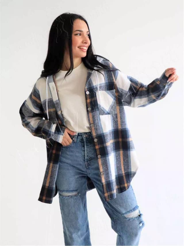 Удлиненная теплая рубашка оверсайз в клетку с капюшоном