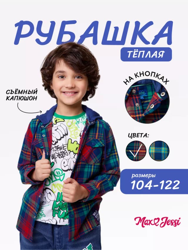 Рубашка для мальчика теплая в клетку с капюшоном
