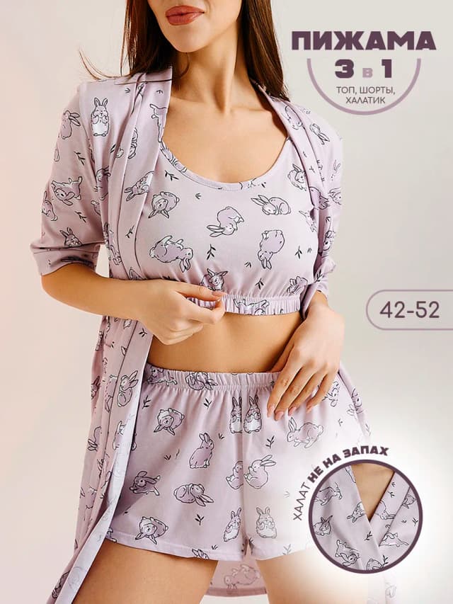 Пижама тройка с шортами и халатом домашняя леопардовая