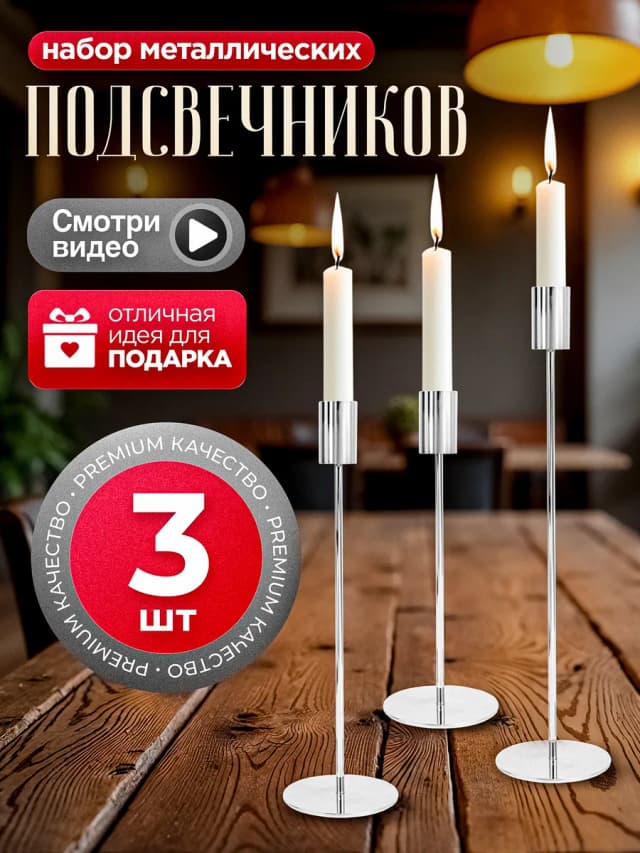 Подсвечники для тонких свечей интерьерные, набор 3 шт