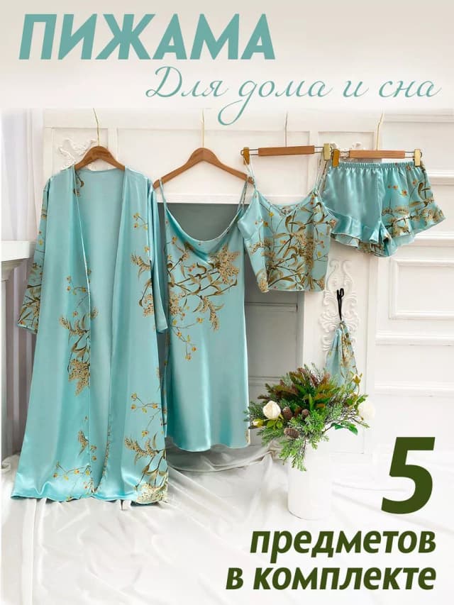 Пижама шелковая домашняя комплект с халатом и шортами 5 в 1