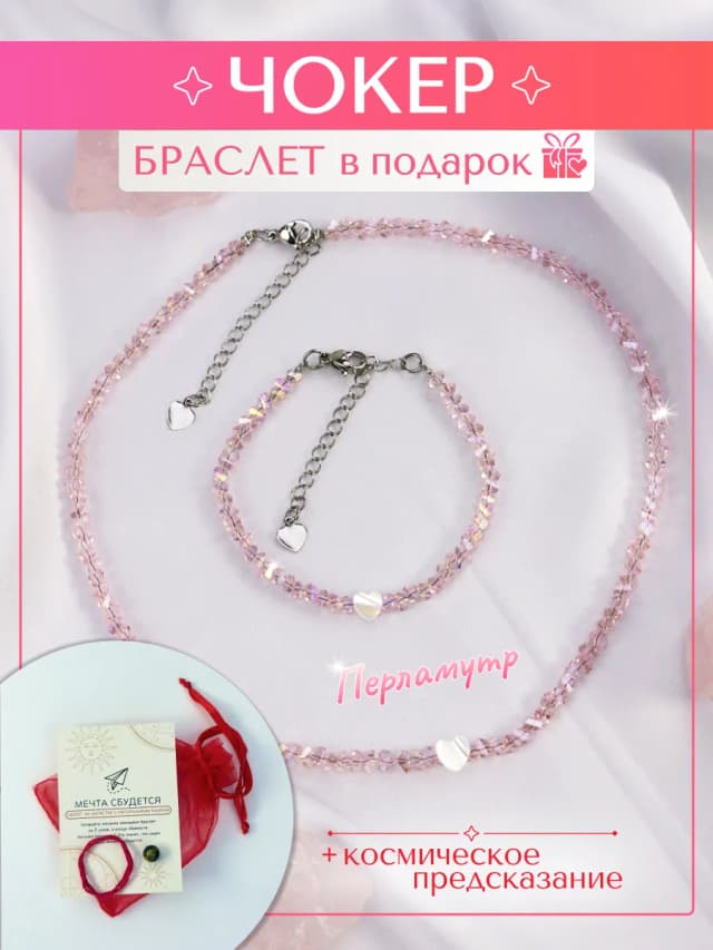Чокер и браслет с сердцем алмазное стекло розовый кварц