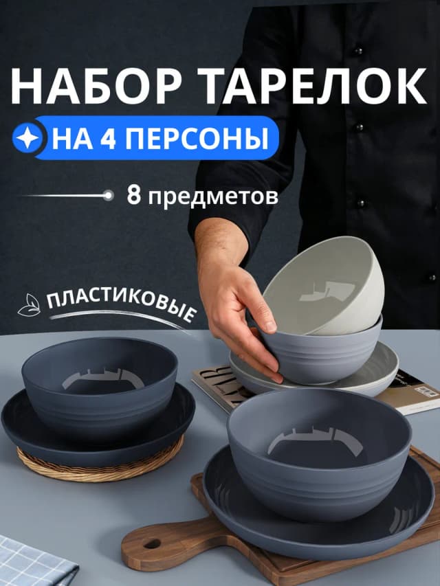 Набор глубоких и плоских пластиковых тарелок на 4 персоны