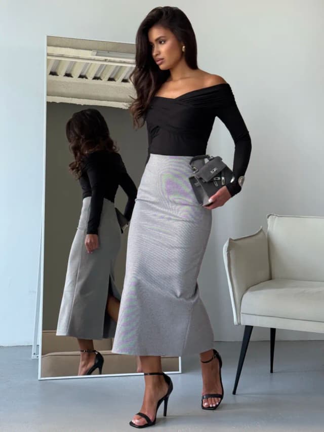 Юбка твидовая миди с разрезом сзади серая
