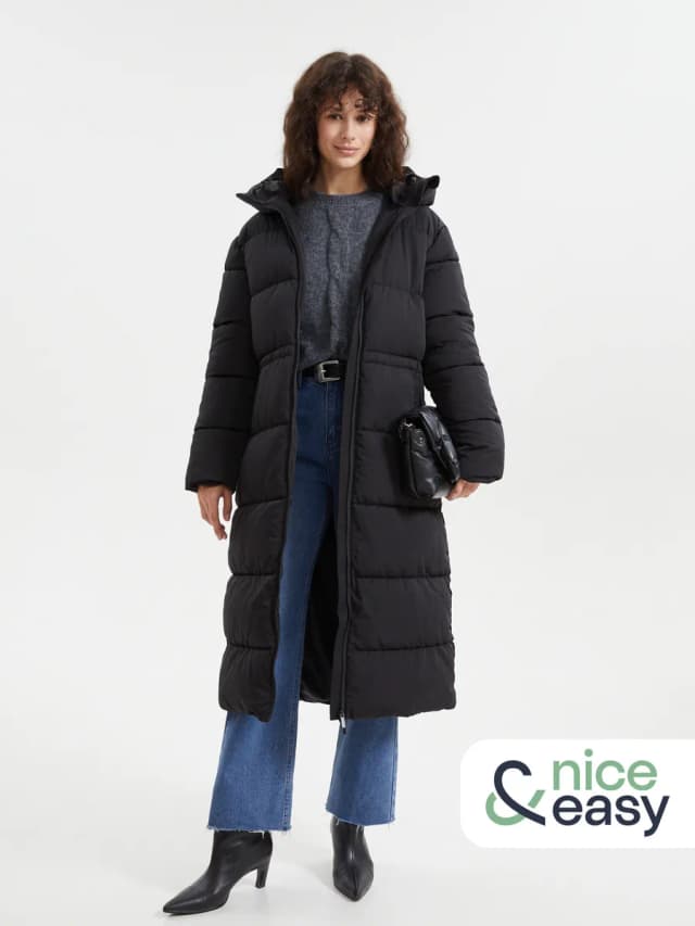Пуховик длинный с капюшоном с поясом