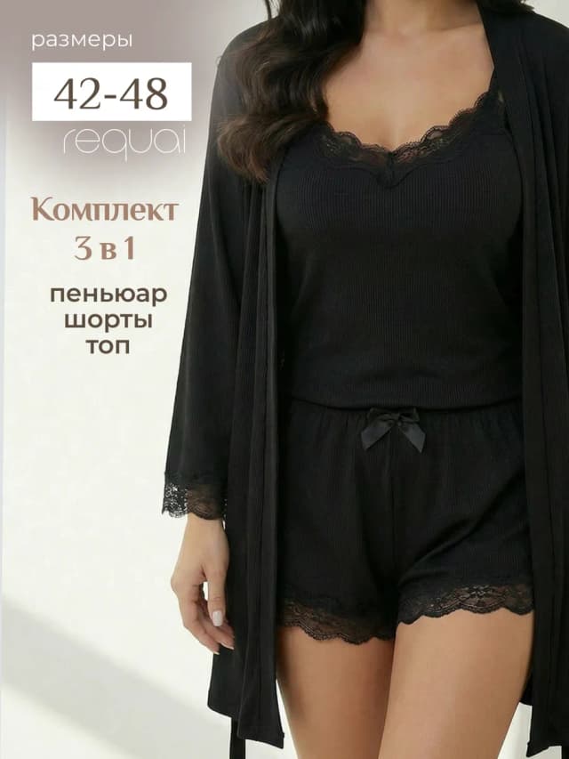 Пижама в рубчик 3 в 1 комплект с шортами майкой и пеньюаром